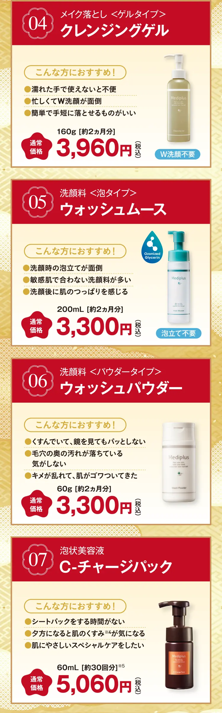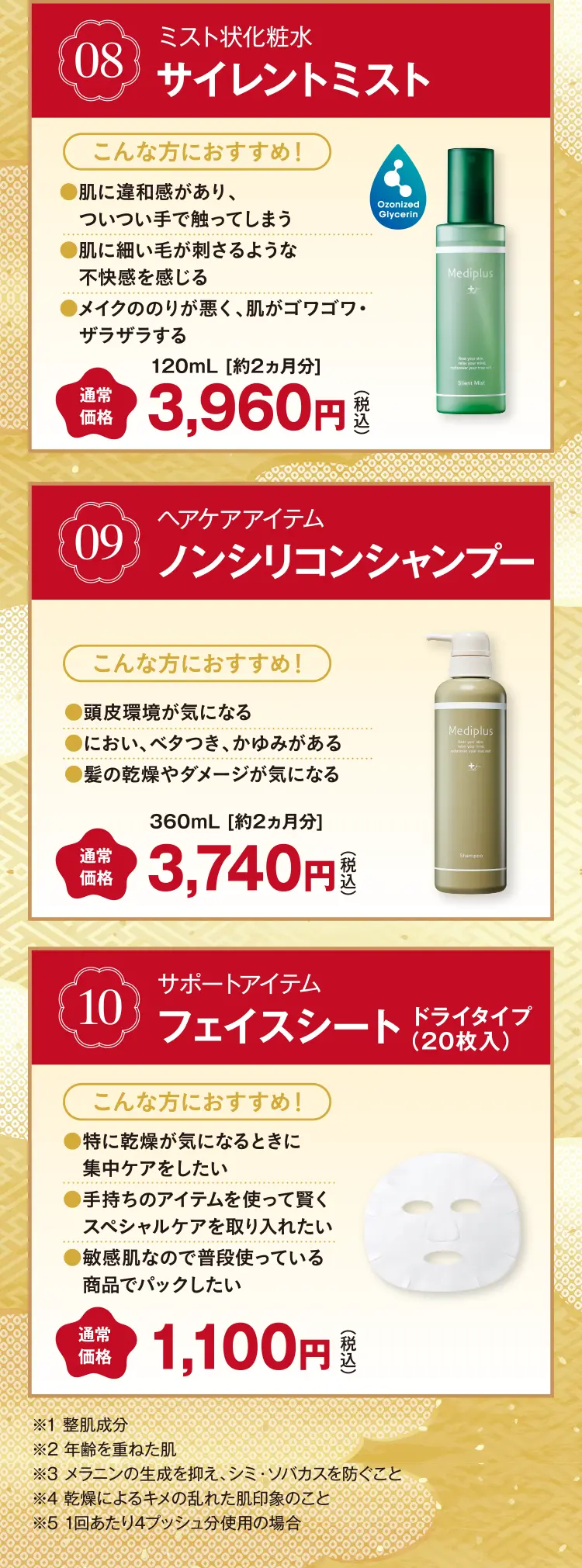 Cセットをそのまま購入したい方はこちら Cセット:敏感な年齢肌をいたわる日中ケアも含めた最高峰のスペシャルケア - ・クレンジングミルク・ウォッシュムース・メディプラスゲルDX・サイレントミスト・フェイスシート(ドライタイプ・20枚入り)