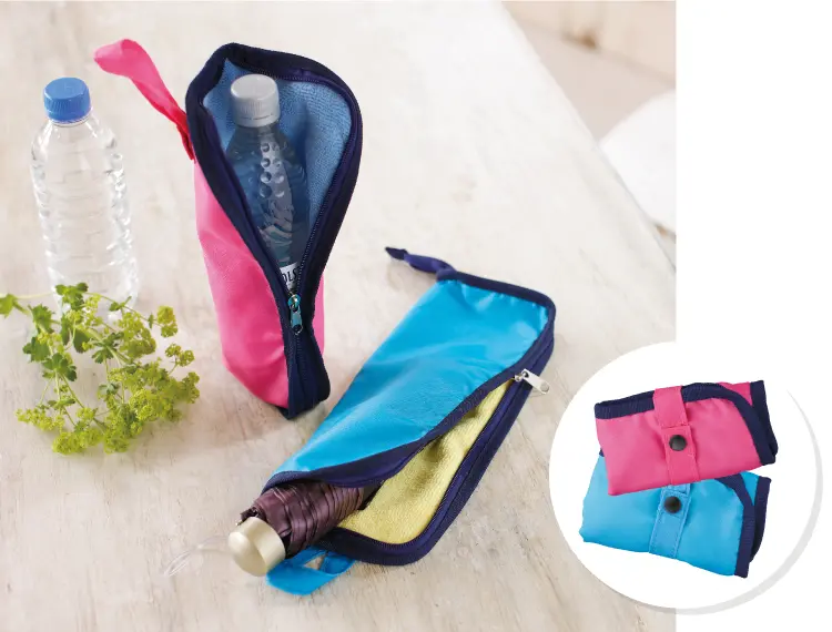 内側は吸収性に優れたマイクロファイバー生地。濡れた折りたたみ傘や、ペットボトルも収納OK!