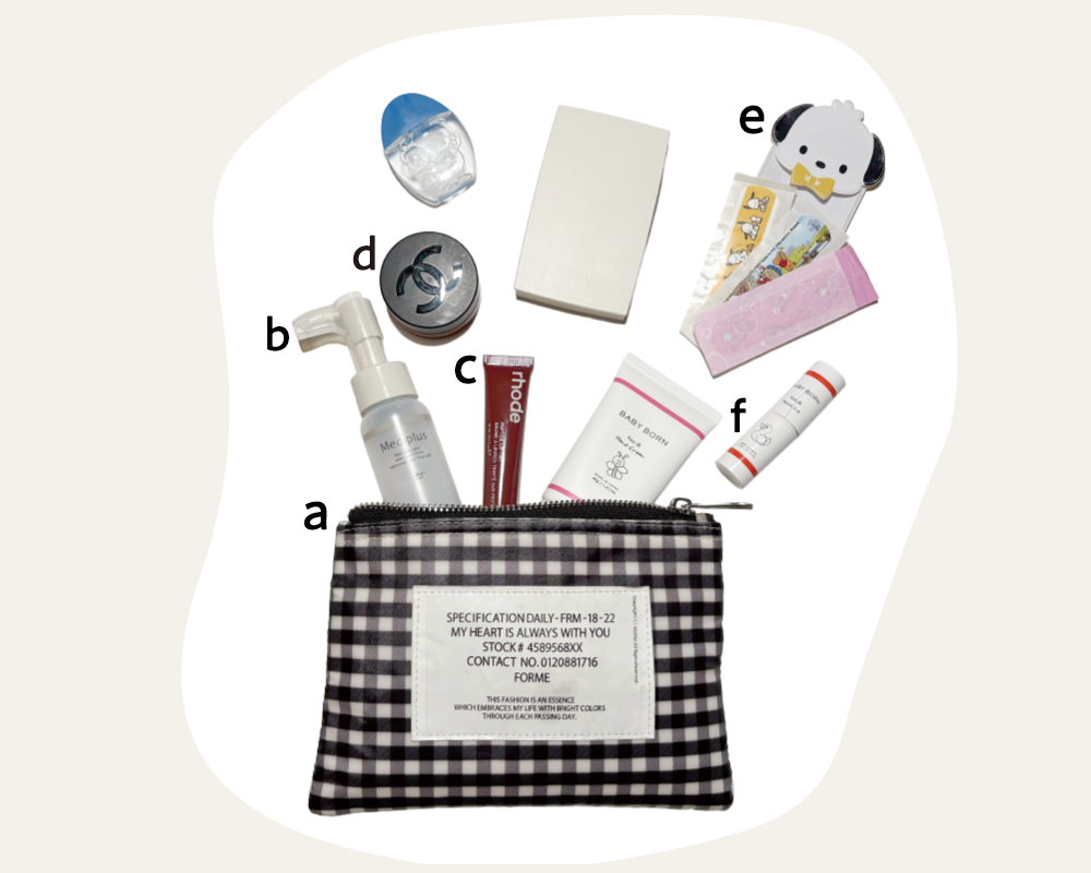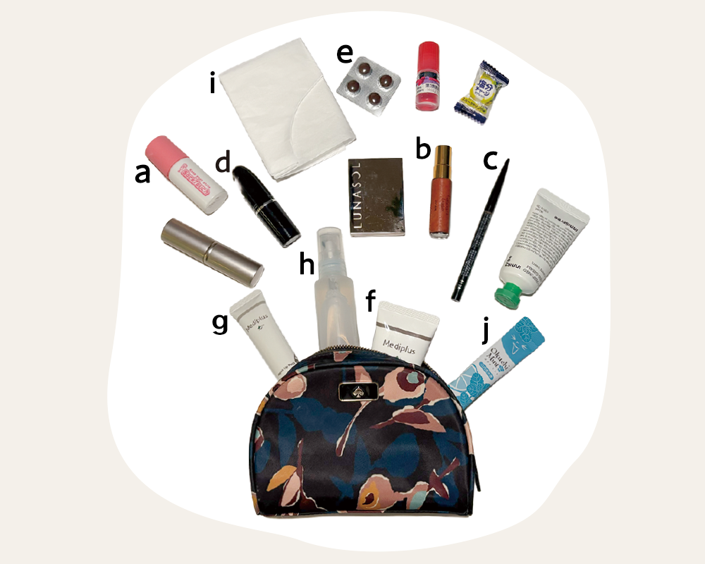平日は営業回りが中心。 商談前はチークとリップで、サッと印象をアップデート。 無駄のない持ち物がご本人のスタイル。 一方、休日はママの顔に。可愛い絆創膏をポーチに忍ばせる。