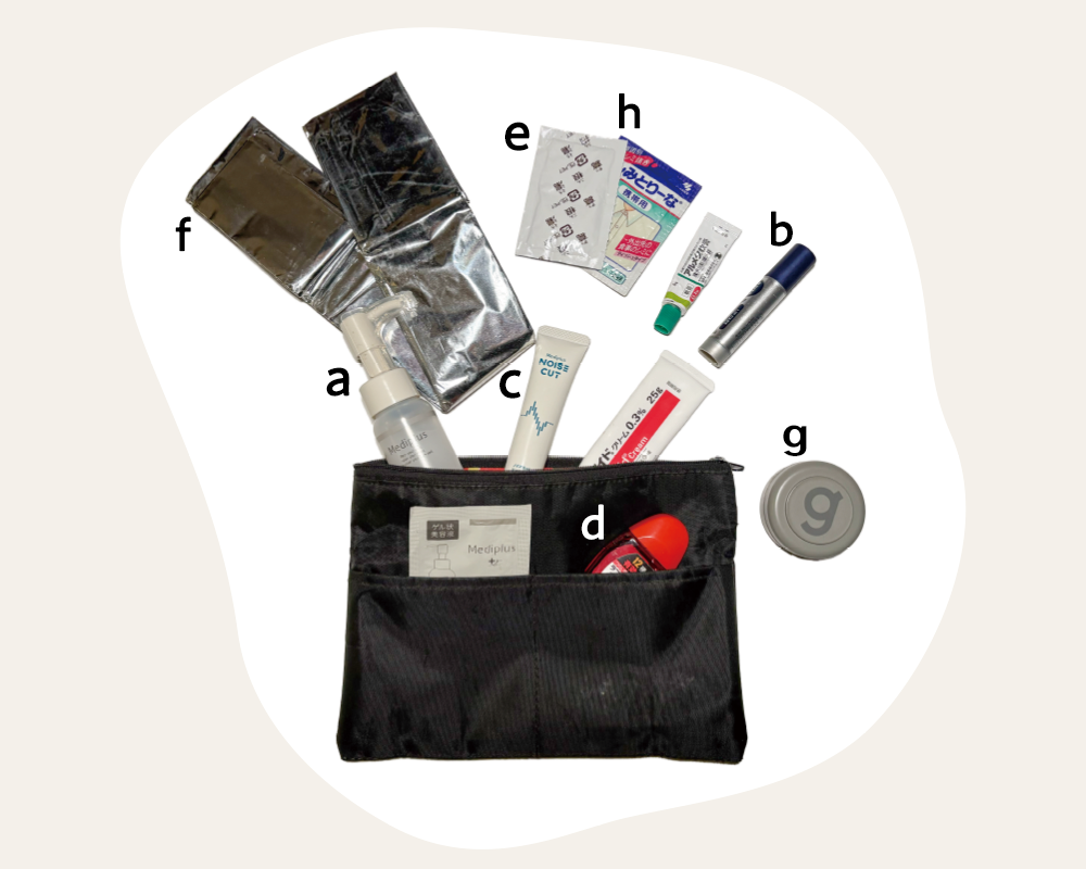 敏感肌のため、出張先の水が合わないときに備えてミニゲル(45g)は常備。2011年の災害以来、防災シートを欠かさず持ち歩く。仕事も私生活も同じポーチで完結させる、几帳面男子。