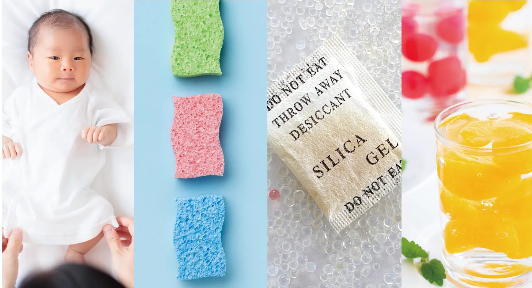 赤ちゃんのオムツ、スポンジ、シリカゲル、ゼリー。