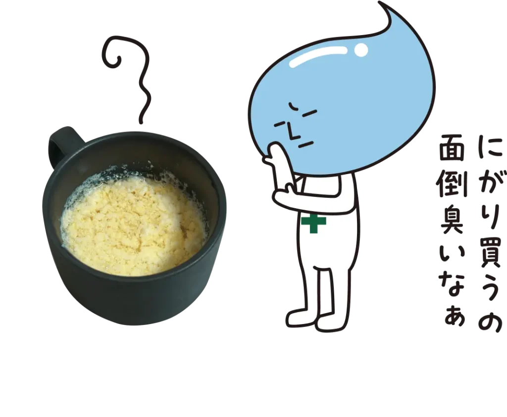500Wの電子レンジで様子を見ながら1~2分加熱。ぶくぶく泡立ってきたら止め、様子を見て 10秒ずつ再加熱。固まったら取り出し、余熱で火を通して完成!